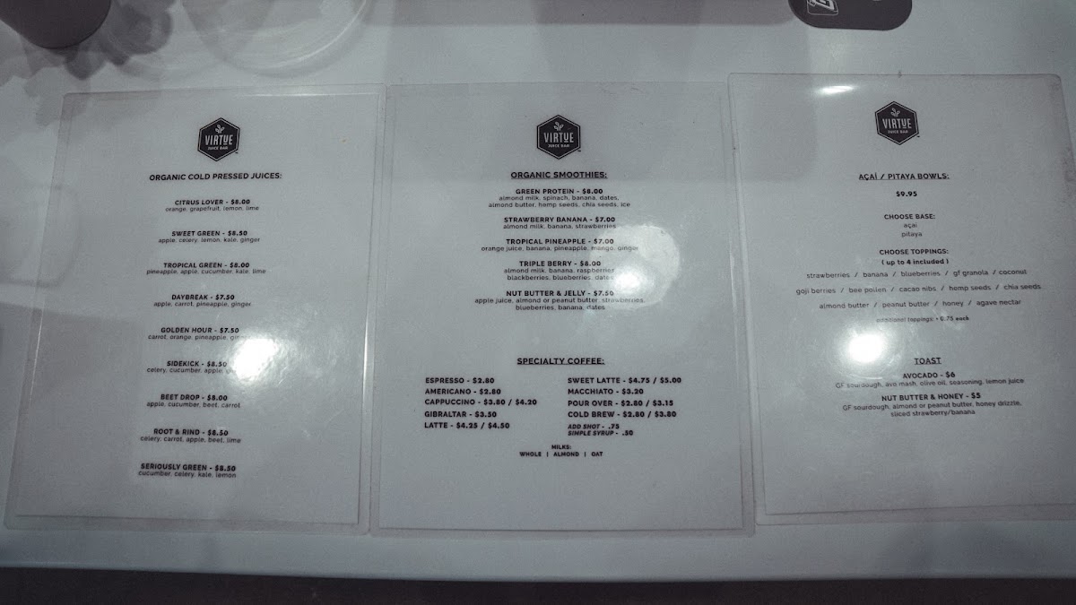 At Virtue Juice, you'll discover a refreshing mix of flavor-packed drinks that bring a little something for everyone. The Virtue Juice Coffee Menu is all about giving you the perfect balance of energizing brews and smooth, satisfying flavors. Whether you're in the mood for a bold espresso or a creamy latte, each drink is made with care, using quality ingredients to start your day off right. From cold brews that hit the spot on hot afternoons to rich cappuccinos that warm you up, there’s a drink for every craving. And if you prefer something lighter, their iced options are a great choice. Conveniently located at 1670 E Monte Vista Ave, Vacaville, CA, it’s the perfect place to swing by for a quick pick-me-up or to linger over your favorite cup. It's a cozy spot where you can find something new to love with every visit.